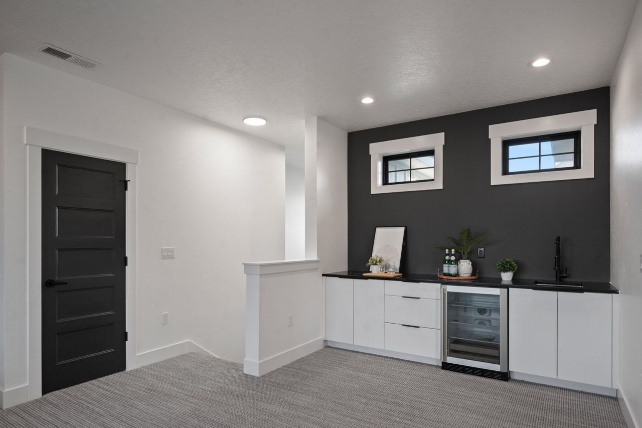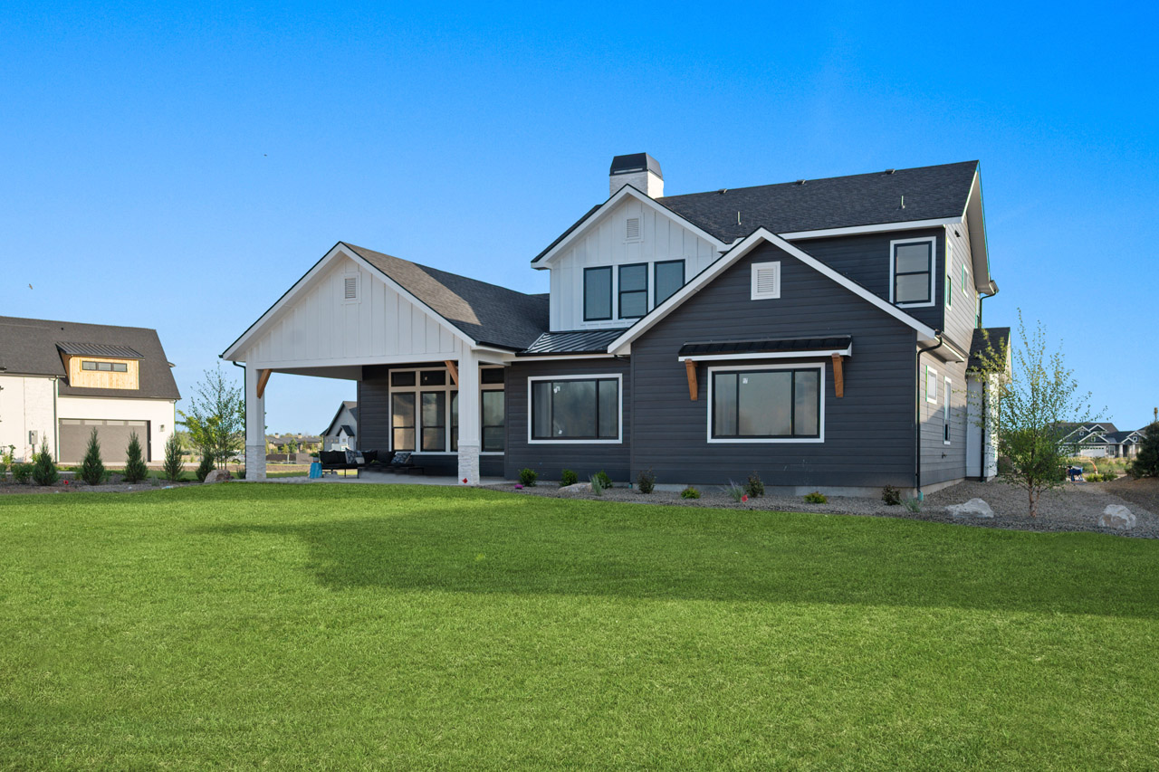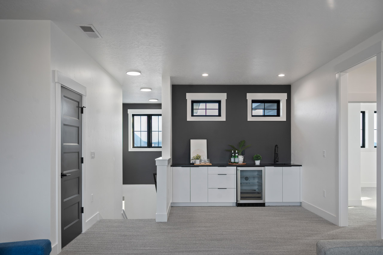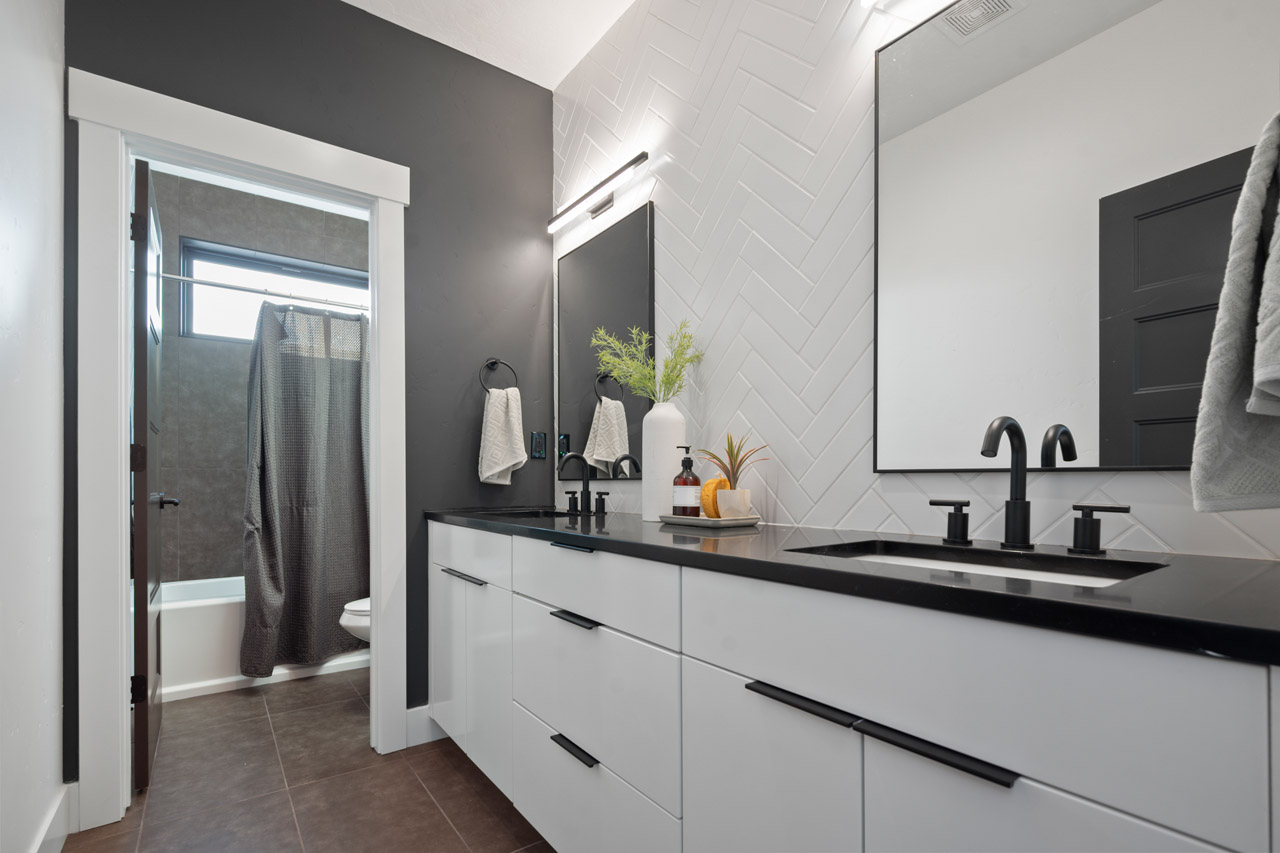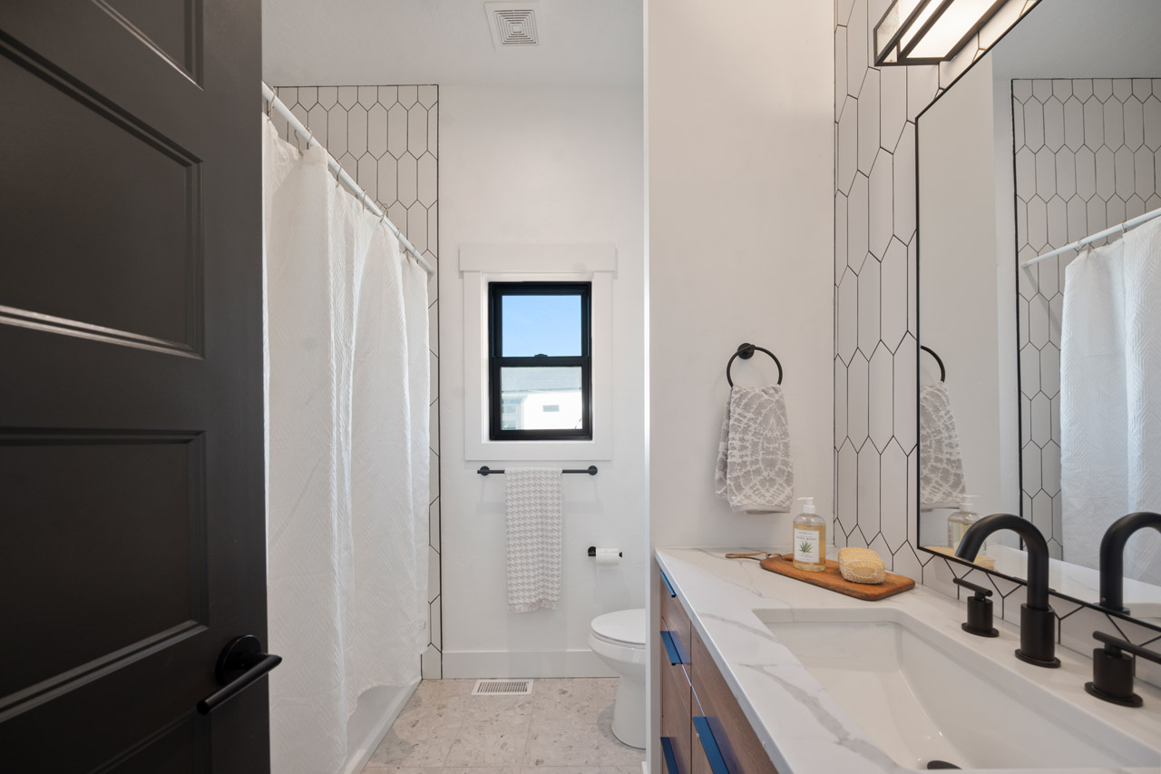 This exceptional home features a captivating herringbone pattern, showcased in the kitchen backsplash tile and carried through the bathrooms, adding a touch of sophistication to every space. The master bedroom boasts a tray ceiling, adding a sense of grandeur to the room. Black windows beautifully complement the black metal faucets and interior doors, creating a cohesive and stylish aesthetic throughout the home. Outside, the roof showcases two materials—black metal and black shingle—adding a modern flair to the exterior. From the impeccable craftsmanship to the thoughtful design elements, Big Wood Way is a testament to luxurious living at its finest.