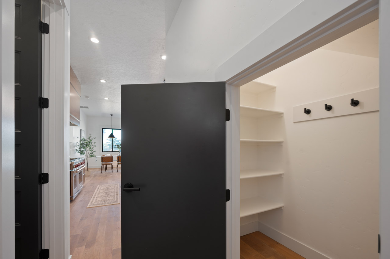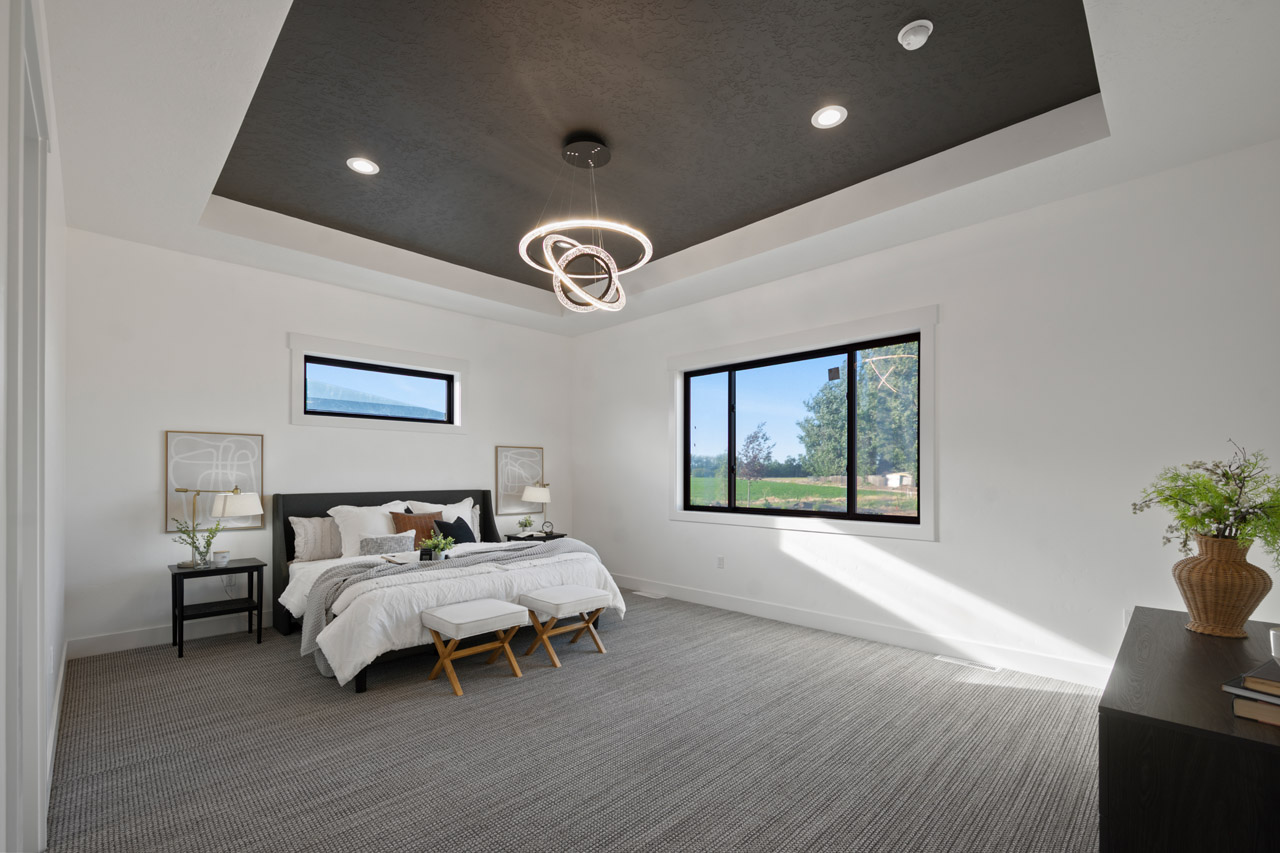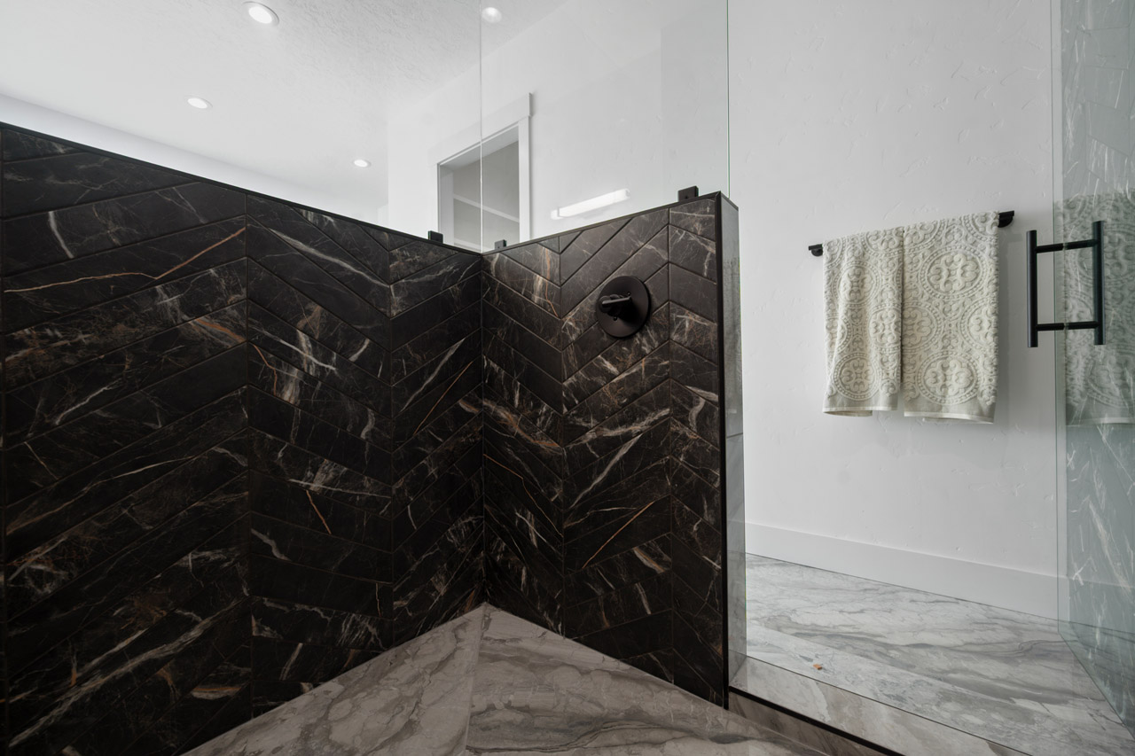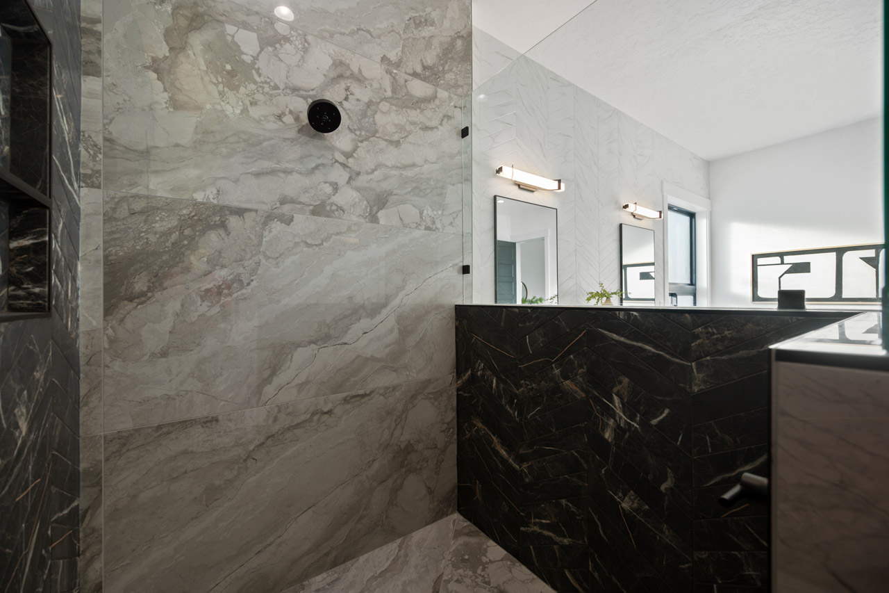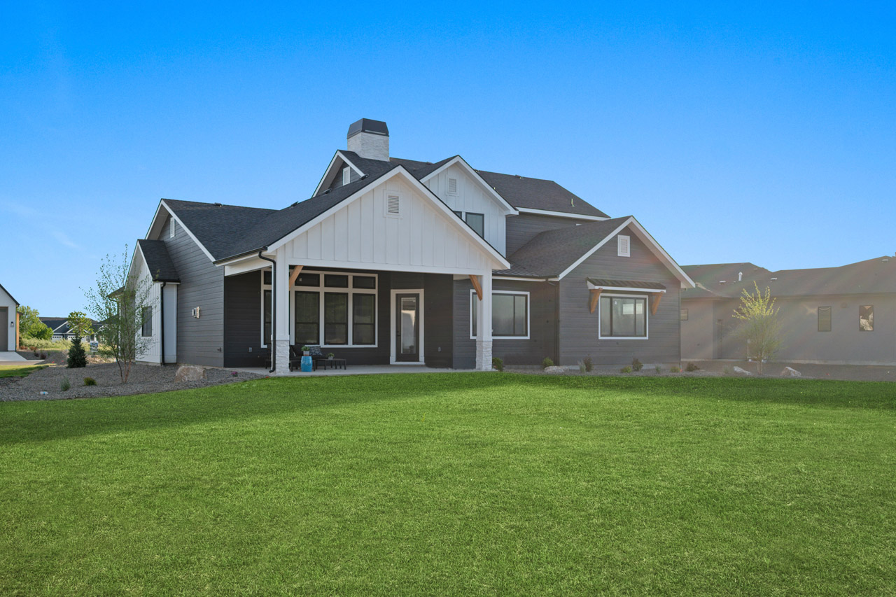 This exceptional home features a captivating herringbone pattern, showcased in the kitchen backsplash tile and carried through the bathrooms, adding a touch of sophistication to every space. The master bedroom boasts a tray ceiling, adding a sense of grandeur to the room. Black windows beautifully complement the black metal faucets and interior doors, creating a cohesive and stylish aesthetic throughout the home. Outside, the roof showcases two materials—black metal and black shingle—adding a modern flair to the exterior. From the impeccable craftsmanship to the thoughtful design elements, Big Wood Way is a testament to luxurious living at its finest.