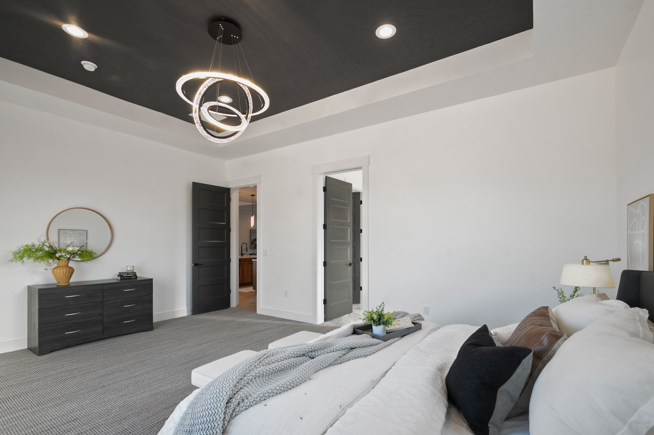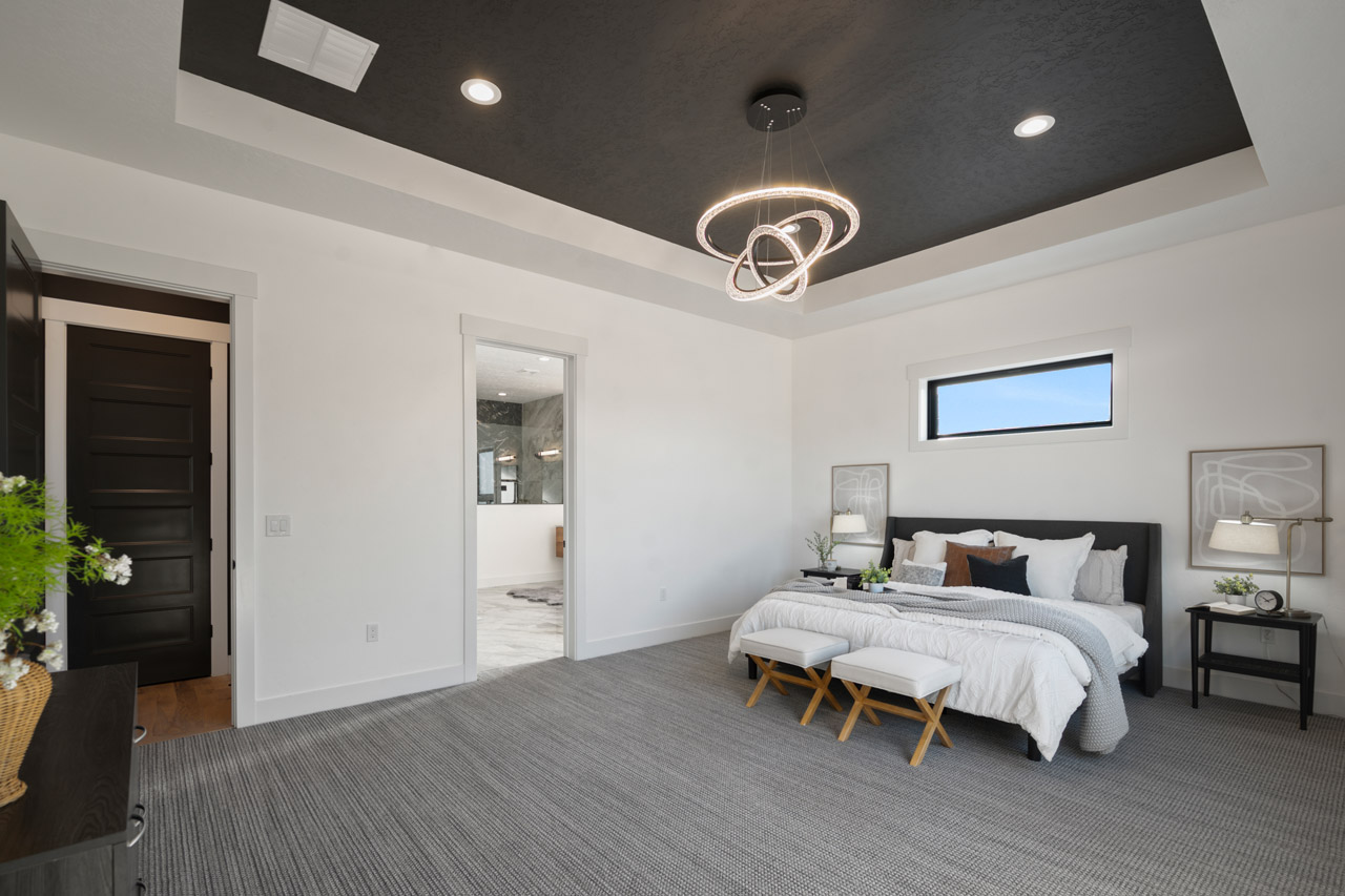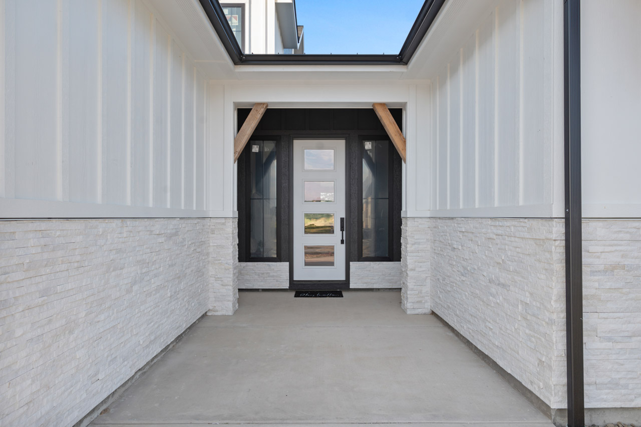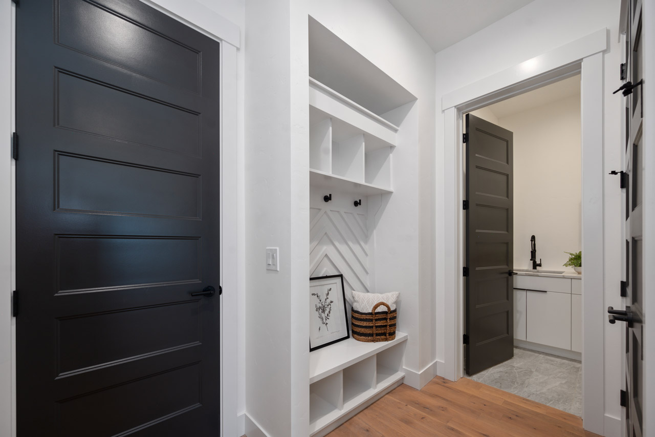 This exceptional home features a captivating herringbone pattern, showcased in the kitchen backsplash tile and carried through the bathrooms, adding a touch of sophistication to every space. The master bedroom boasts a tray ceiling, adding a sense of grandeur to the room. Black windows beautifully complement the black metal faucets and interior doors, creating a cohesive and stylish aesthetic throughout the home. Outside, the roof showcases two materials—black metal and black shingle—adding a modern flair to the exterior. From the impeccable craftsmanship to the thoughtful design elements, Big Wood Way is a testament to luxurious living at its finest.