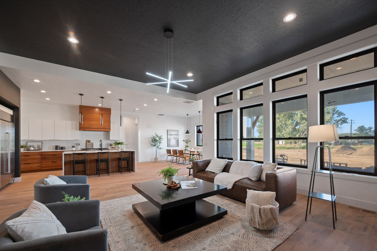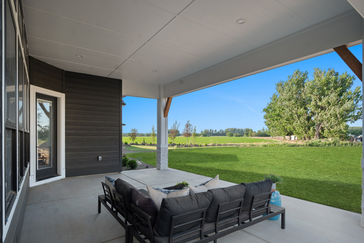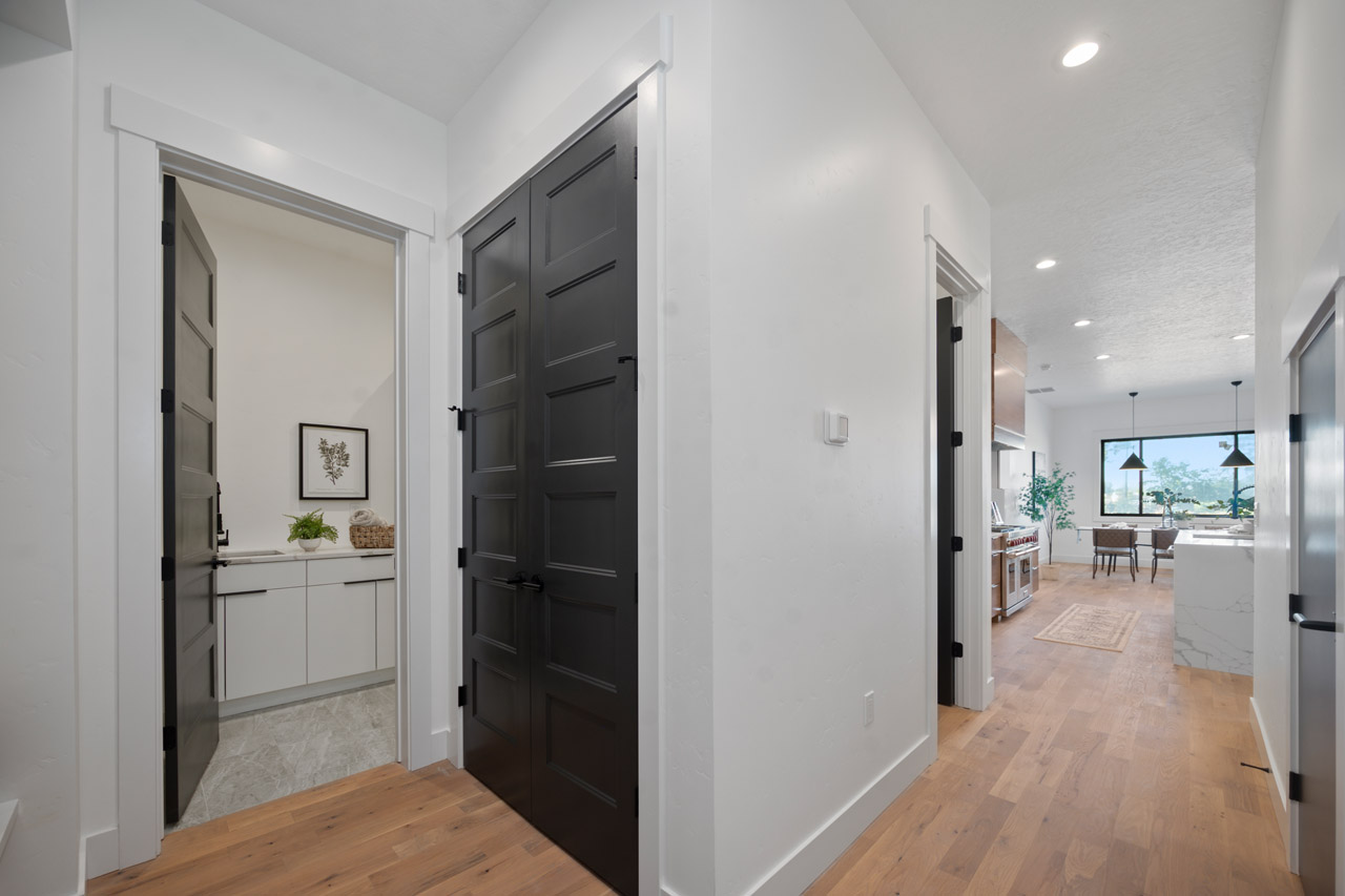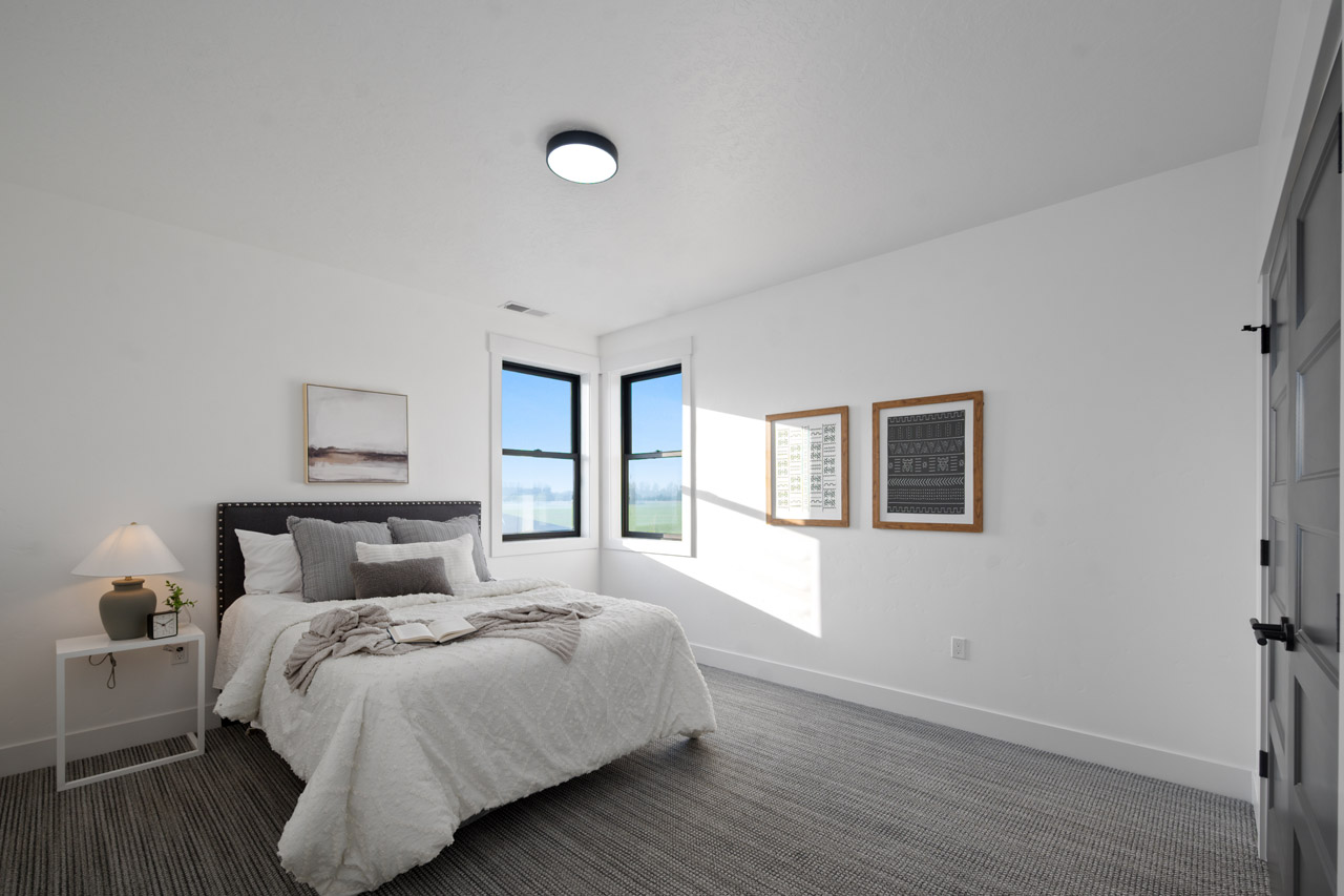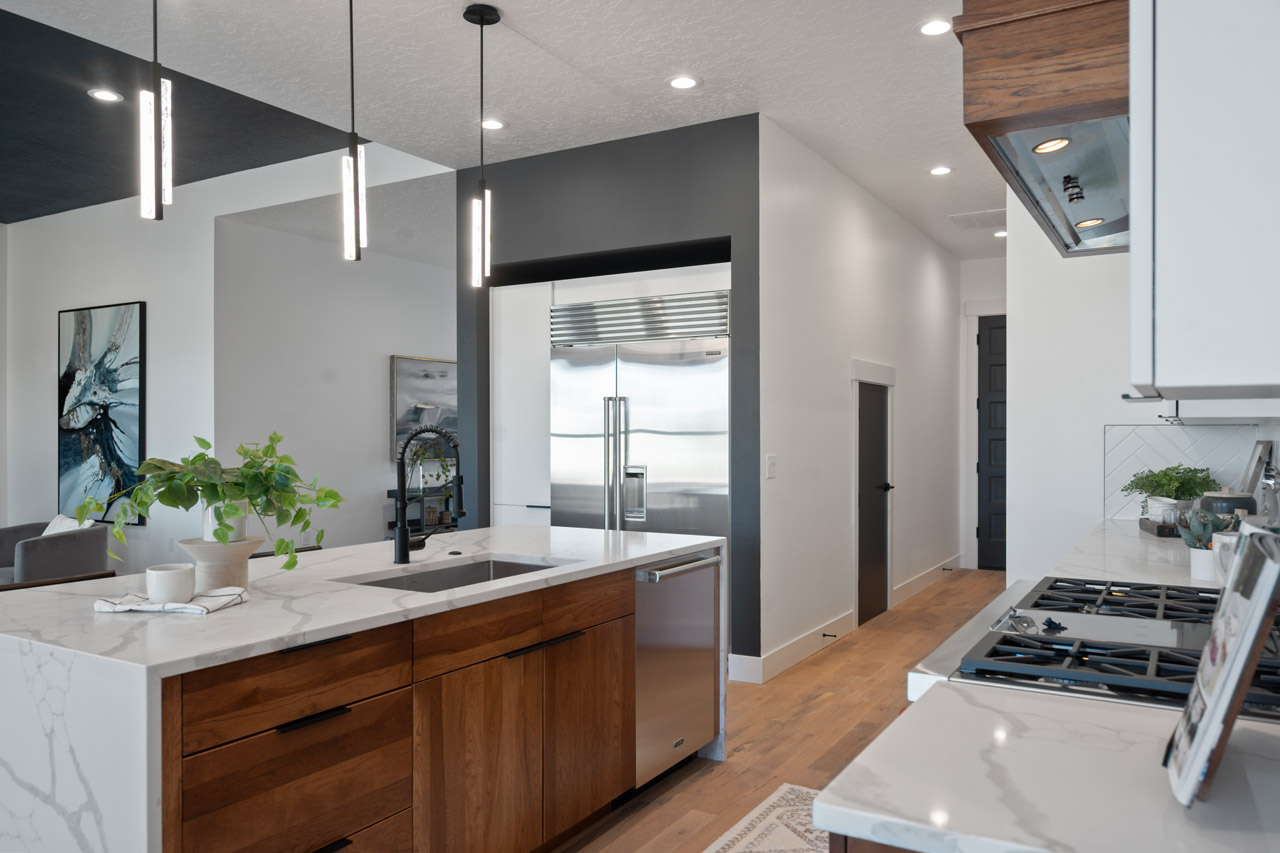 This exceptional home features a captivating herringbone pattern, showcased in the kitchen backsplash tile and carried through the bathrooms, adding a touch of sophistication to every space. The master bedroom boasts a tray ceiling, adding a sense of grandeur to the room. Black windows beautifully complement the black metal faucets and interior doors, creating a cohesive and stylish aesthetic throughout the home. Outside, the roof showcases two materials—black metal and black shingle—adding a modern flair to the exterior. From the impeccable craftsmanship to the thoughtful design elements, Big Wood Way is a testament to luxurious living at its finest.